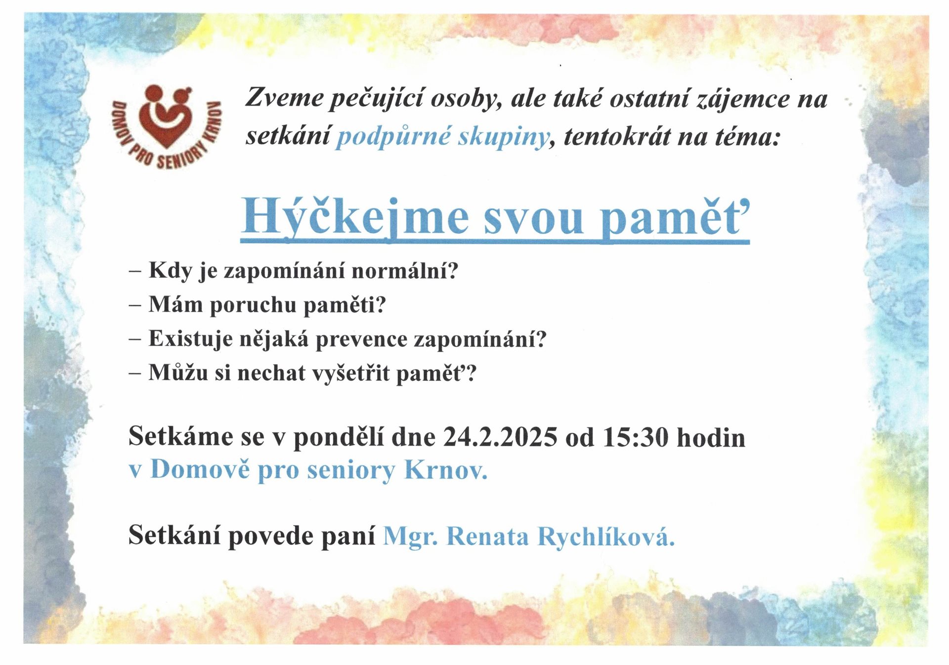 Přijďte na další setkání podpůrné skupiny pro pečující, která se bude konat v pondělí 24. února od 15.30 hodin.