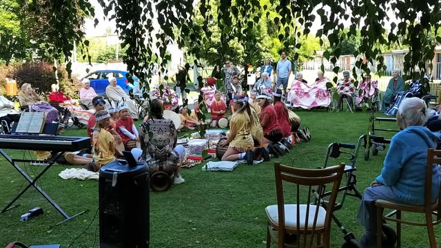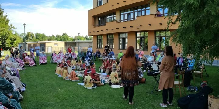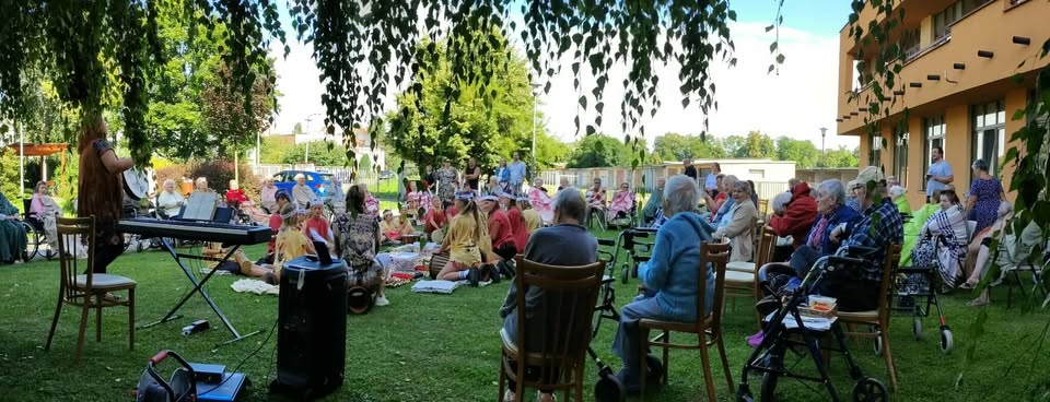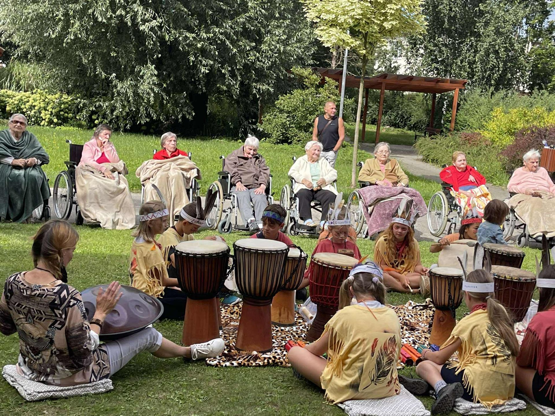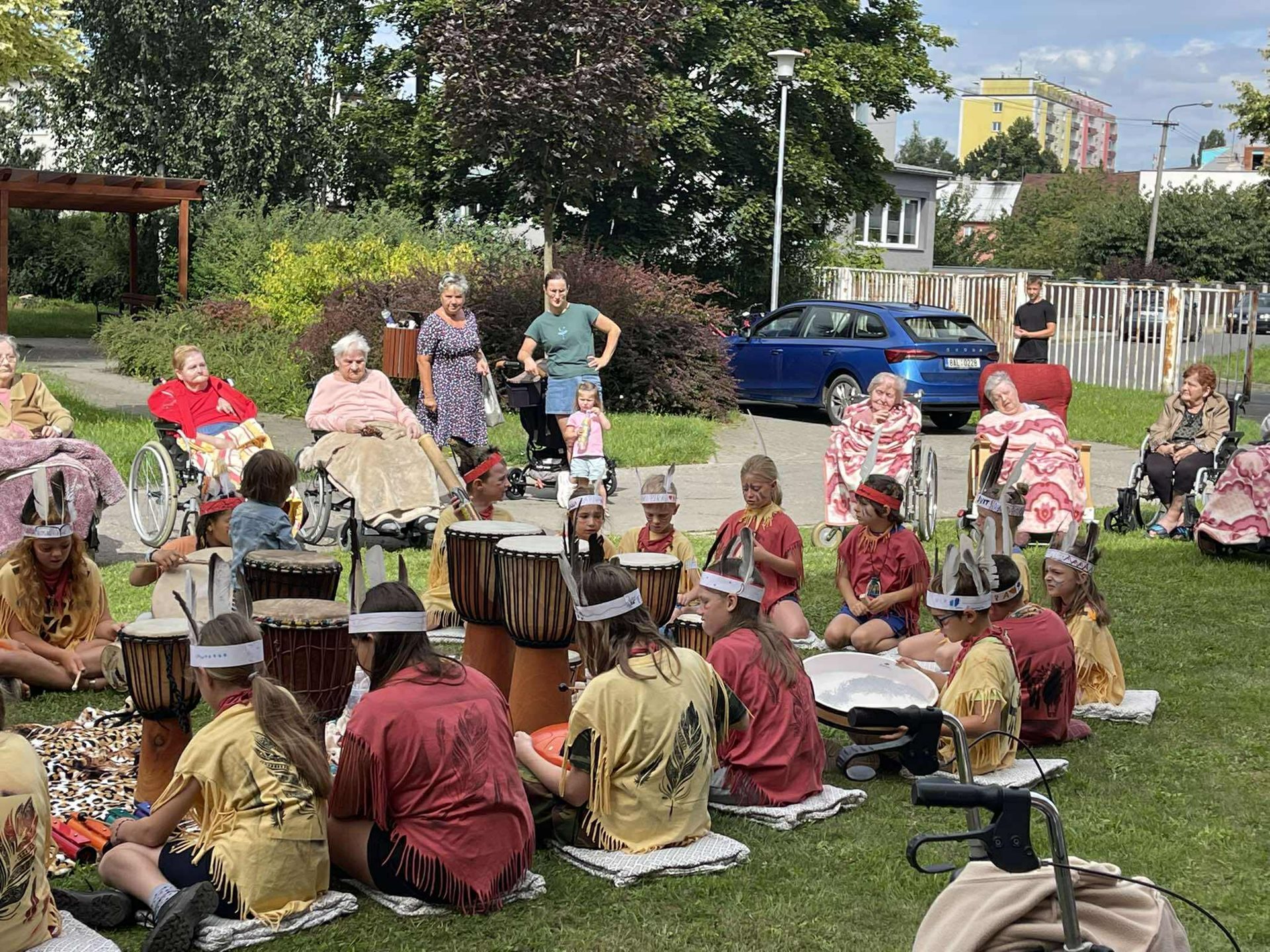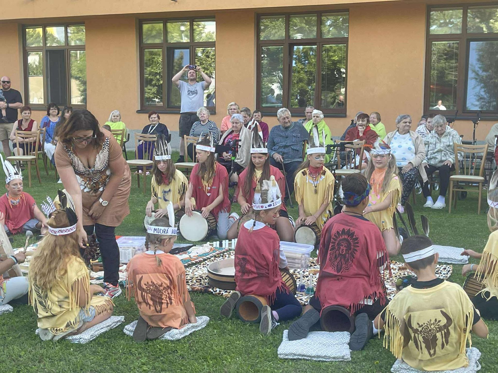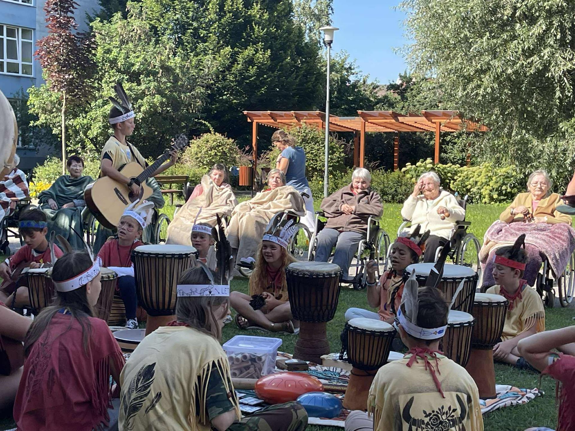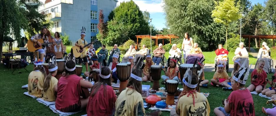 Děti si s sebou přinesly nejen dobrou náladu, ale i celou řadu netradičních hudebních nástrojů – od bubínků a chrastítek po méně tradiční kousky, které by možná ocenil i sám náčelník Vinnetou. Společně zazpívali a zahráli spoustu písní, do kterých se s radostí zapojili i naši klienti. Zpívalo se, tleskalo, podupávalo – a ano, někteří se dokonce i lehce rozhoupali v rytmu.