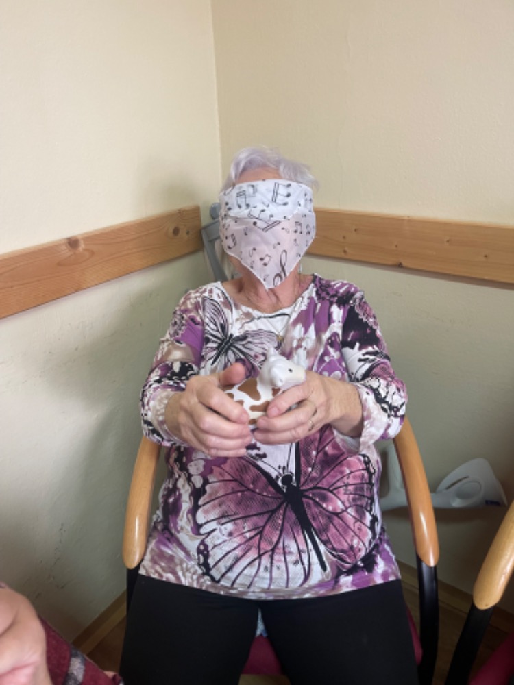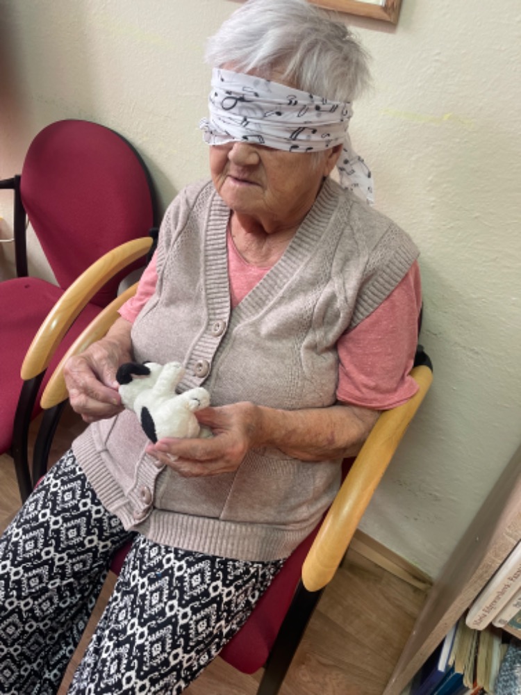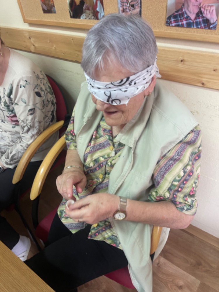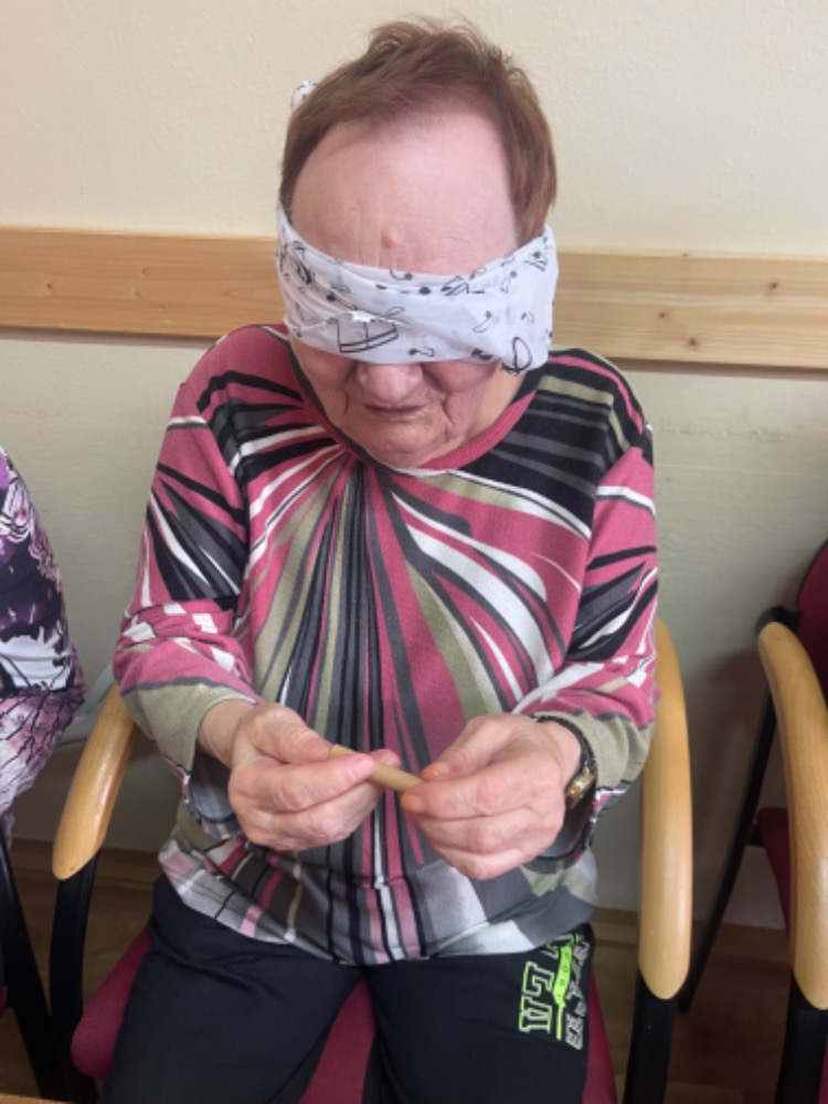 V dopoledním klubu si klienti nejenže o tomto nesnadném způsobu života povídali, také si vyzkoušeli poznávání předmětů se zavázanýma očima.