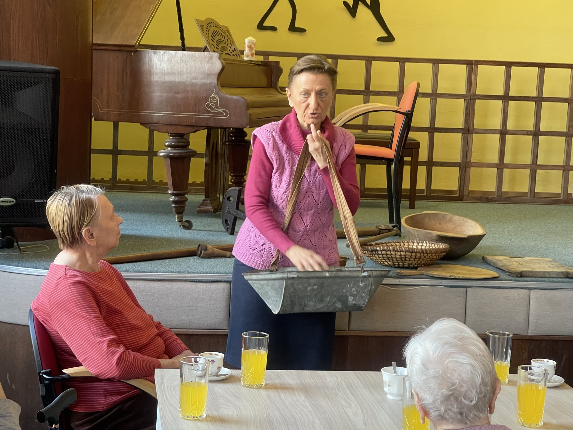 Toto vesnické muzeum nacházející se nedaleko od Krnova je plné krásných exponátů ukazující práci a život našich předků ve všech jeho podobách. A protože není vždy v našich silách udělat si výlet, přijali tito skvělí lidé naši nabídku a přijeli za námi. A nepřijeli samozřejmě sami, vzali si s sebou spoustu vzácných exponátních kousků. Klienti se zájmem poslouchali vyprávění paní Klusákové, která nám zazpívala Slezskou hymnu a rovněž přidávali sami i vlastní vzpomínky. Společný čas utekl velmi rychle a my jsme skutečně rádi, že k nám manželé Klusákovi se svými klenoty zavítali. Rovněž doufáme, že jsme je u nás neviděli naposledy. Schválně, poznáte, na co která věc sloužila?